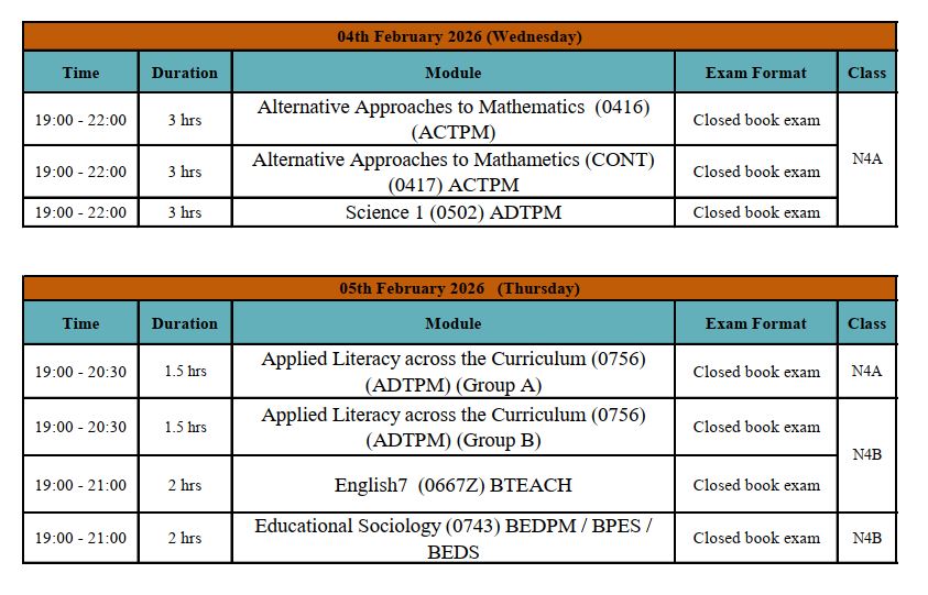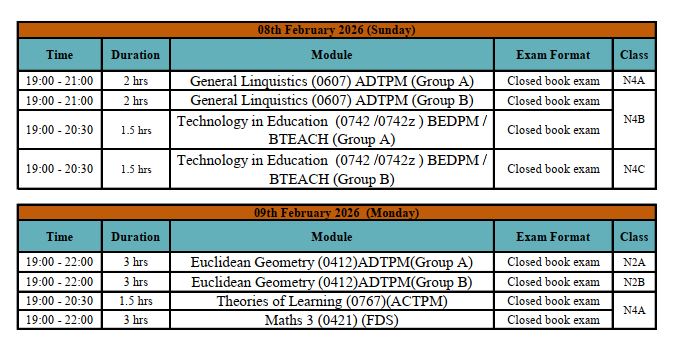 Exam Timetable by Saleema Hassan - Thursday, 29 January 2026, 2:26 PM Number of replies: 0 Download Exam TimetableDownload Student GroupsDownload Notice to CandidatesPlease read the NOTICE FOR CANDIDATES before attending the exam. Permalink