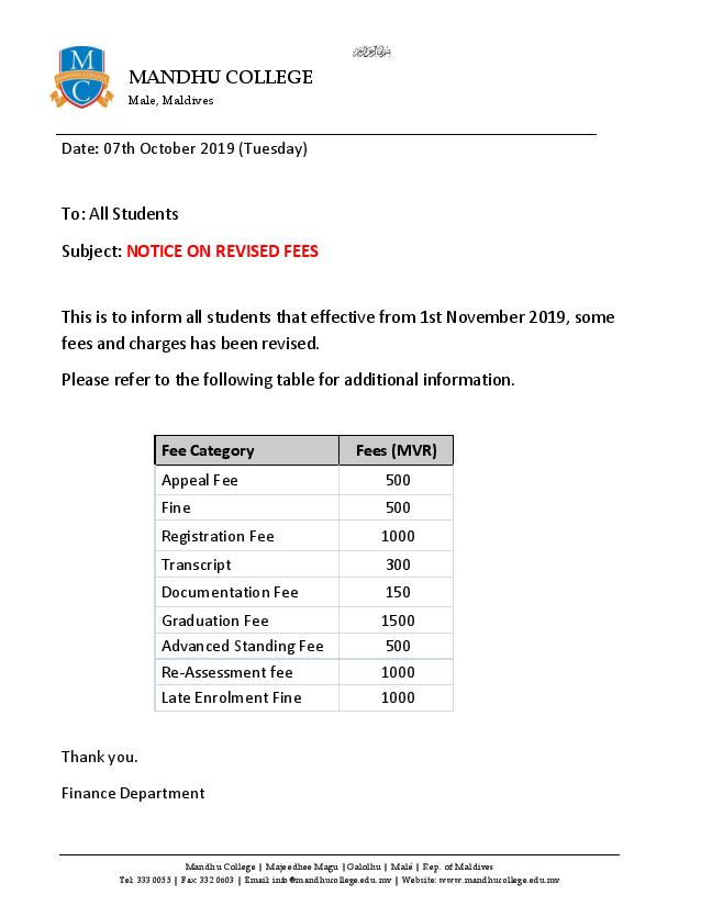 Notice on Revised Fees by Ahmed Nithaaf - Monday, 7 October 2019, 4:23 PM Number of replies: 0 Permalink