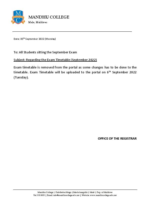 Regarding Exam Timetable by Aishath Vileena - Monday, 5 September 2022, 3:31 PM Number of replies: 0 Permalink