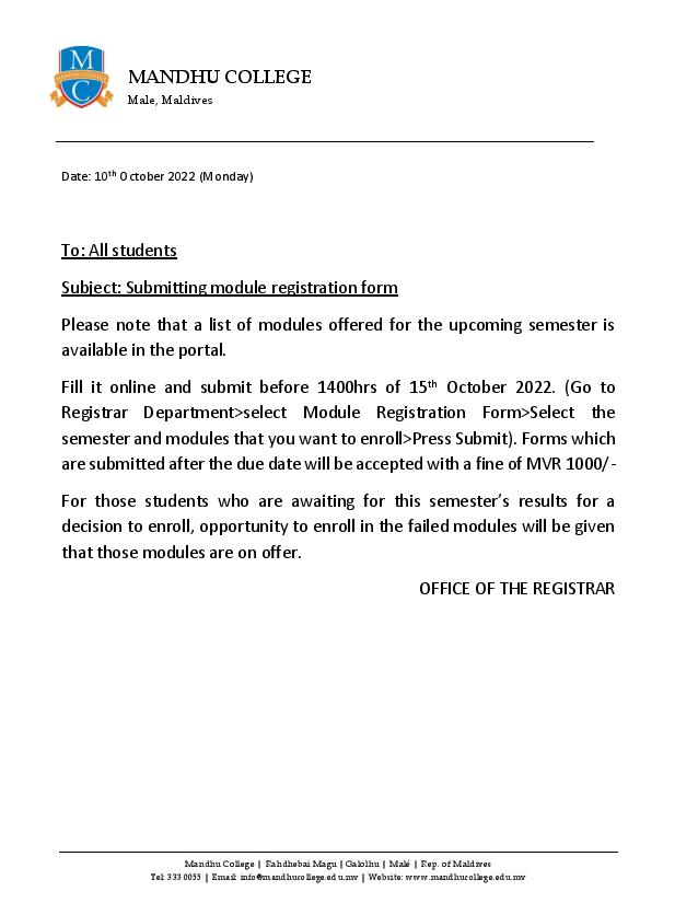 Module registration Sem 2/2022 by Aishath Vileena - Monday, 10 October 2022, 6:24 PM Number of replies: 0 Permalink