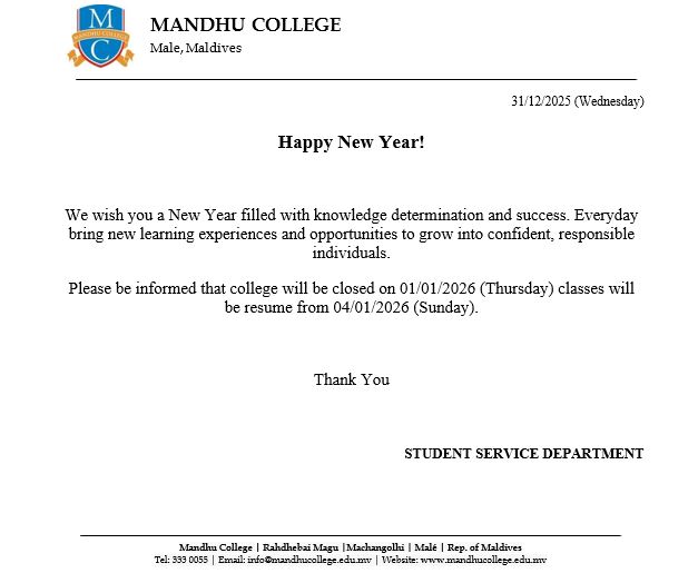 Attention to All by Fathimath Zayyana - Wednesday, 31 December 2025, 3:11 PM Number of replies: 0 Permalink