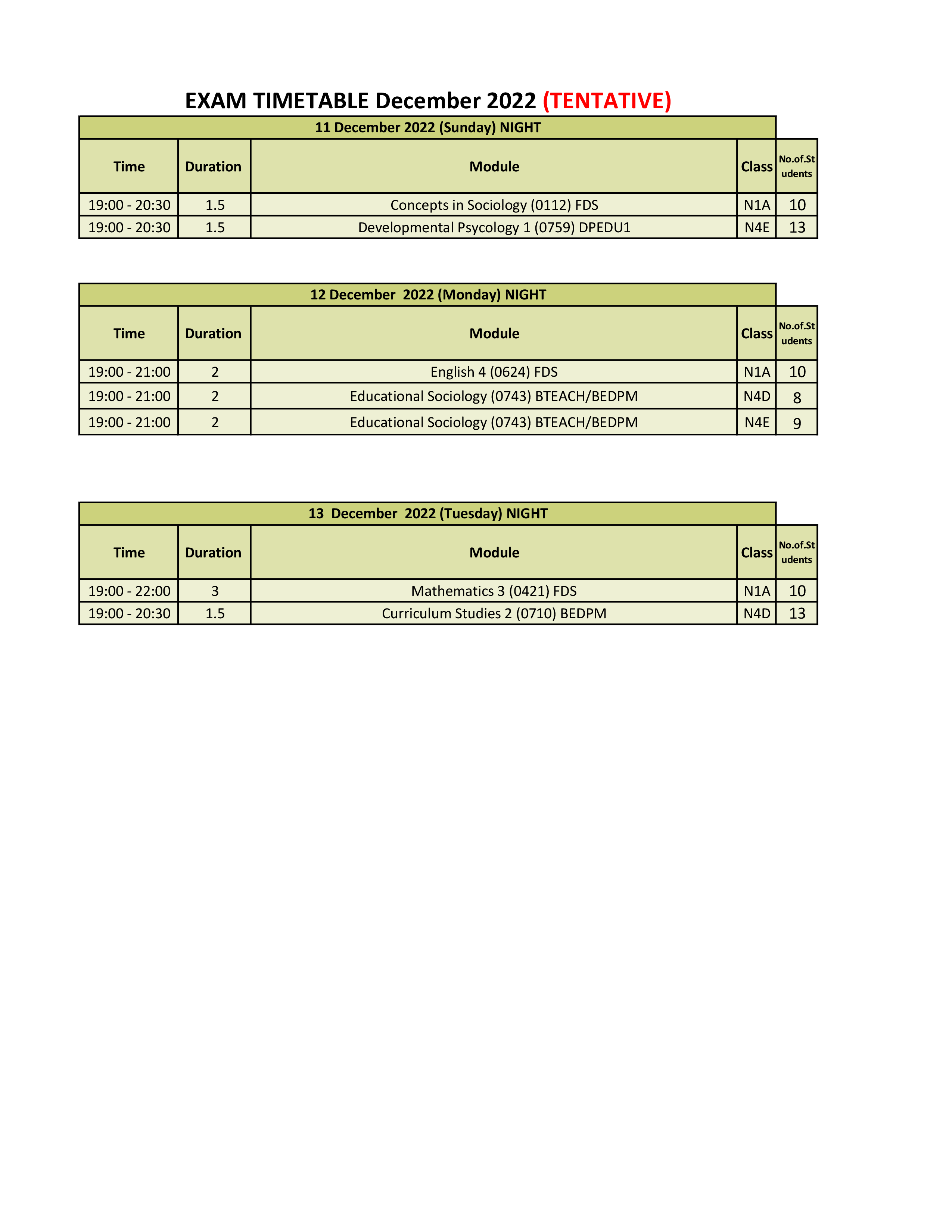 Exam Timetable (December) Tentative by Zahura Zahir - Sunday, 27 November 2022, 6:37 PM Number of replies: 0 Download Notice to CandidatesDownload Exam TimetableDownload GroupsPlease read the notice for candidates for exam details. Permalink