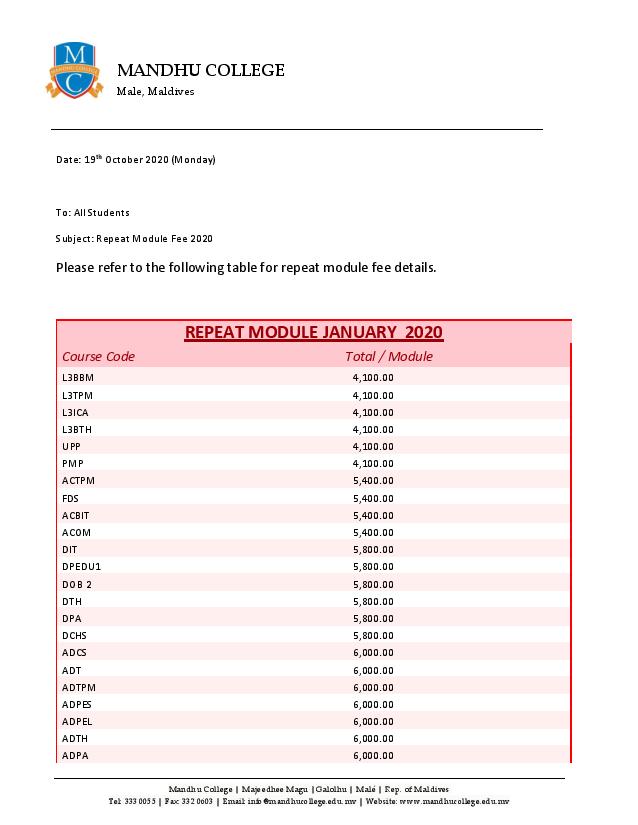 Repeat Module Fees by Ahmed Nithaaf - Monday, 19 October 2020, 11:45 AM Number of replies: 0 Permalink