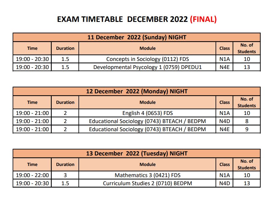Exam TimeTable December 2022 (FINAL) by Saleema Hassan - Wednesday, 7 December 2022, 8:03 PM Number of replies: 0 Exam Timetable Notice to CandidatesStudent GroupsPlease read the NOTICE FOR CANDIDATES before attending the exam. Permalink