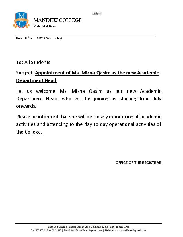 Appointment of Ms. Mizna Qasim as the new Academic Department Head by Aishath Vileena - Wednesday, 30 June 2021, 11:11 AM Number of replies: 0 Permalink