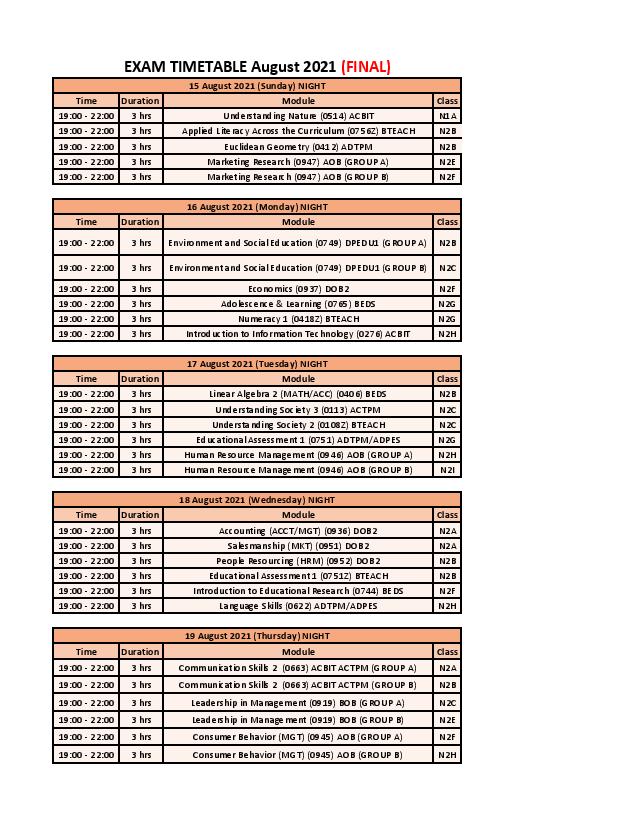Exam Timetable Aug 2021 (FINAL)/Notice to Candidates (UPDATED) by Aishath Vileena - Sunday, 25 July 2021, 4:13 PM Number of replies: 0 Download Exam Timetable Download Exam GroupsDownload NOTICE TO CANDIDATES (UPDATED)Please read the notice to candidates before attending the exam. Permalink