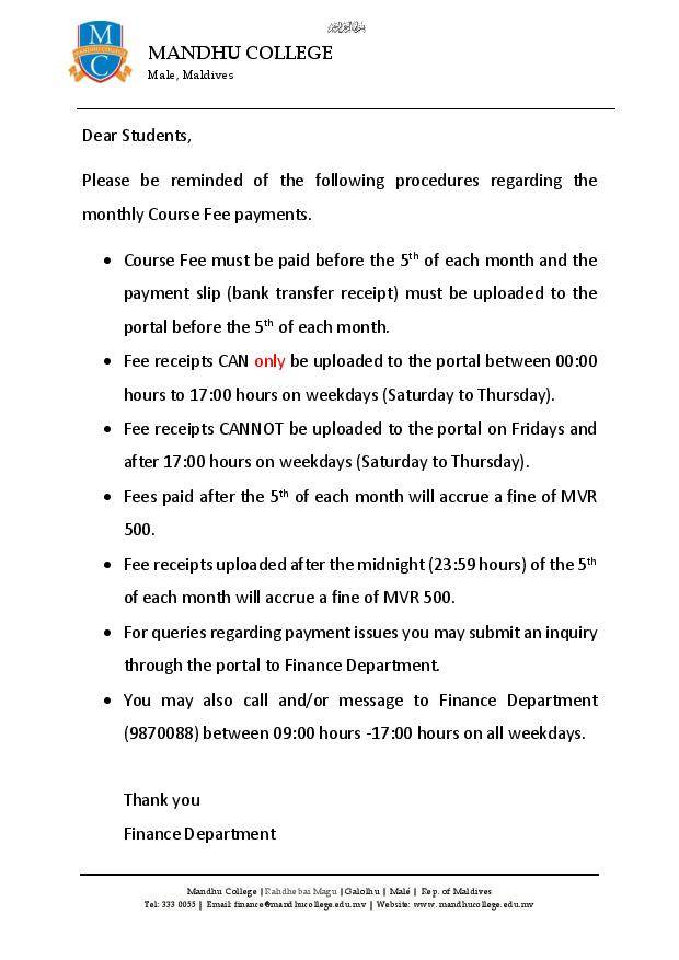 Payment Notice by Aishath Vileena - Monday, 20 September 2021, 3:30 PM Number of replies: 0 Permalink