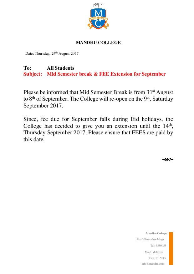 Mid Semester break & FEE Extension for September by Ashiyath Zumra - Thursday, 24 August 2017, 1:30 PM Number of replies: 0 Permalink