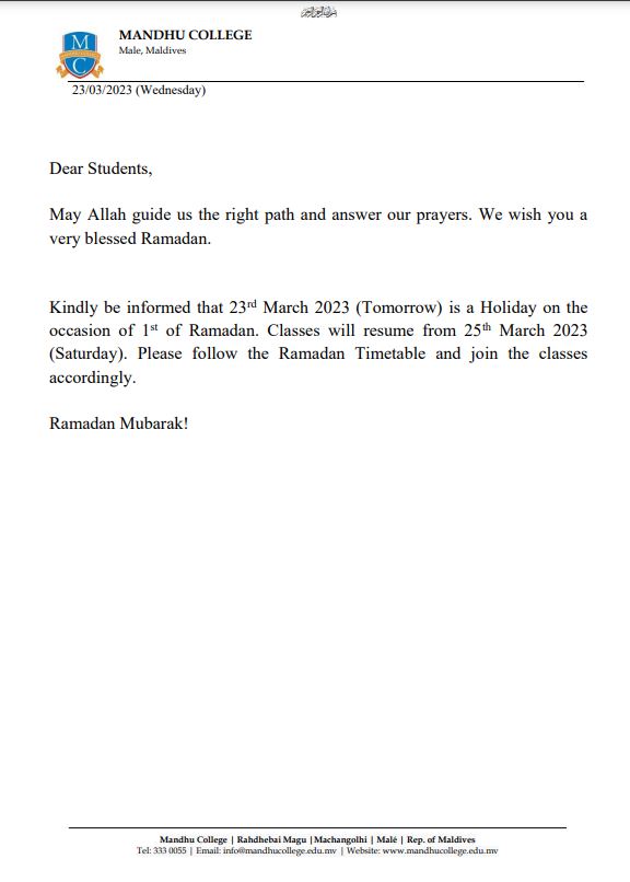 To All Students by Saleema Hassan - Wednesday, 22 March 2023, 7:01 PM Number of replies: 0 Download Ramadan Timetable Permalink