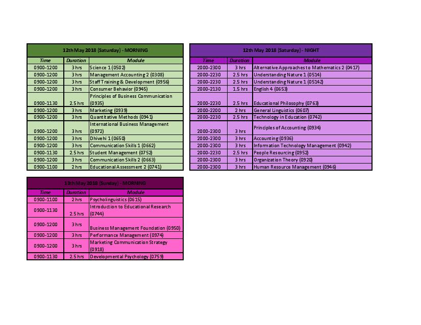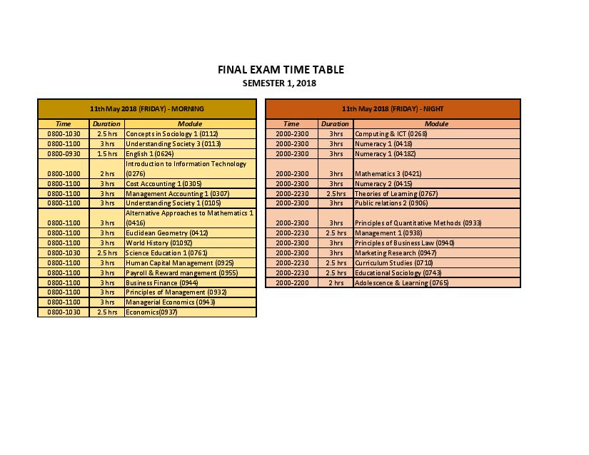 Final Time Table Sem1, 2018 and Student List by Ashiyath Zumra - Thursday, 3 May 2018, 4:52 PM Number of replies: 0 Download Students by Centre listDownload Final Time Table Sem1, 2018 Permalink