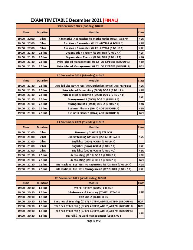 EXAM TIMETABLE FINAL (DEC 2021) by Aishath Vileena - Monday, 6 December 2021, 9:42 AM Number of replies: 0 Download NOTICE FOR CANDIDATESDownload Exam TimetableDownload GroupsPlease read the NOTICE FOR CANDIDATES before attending the exam. Permalink