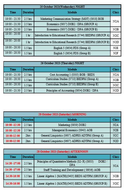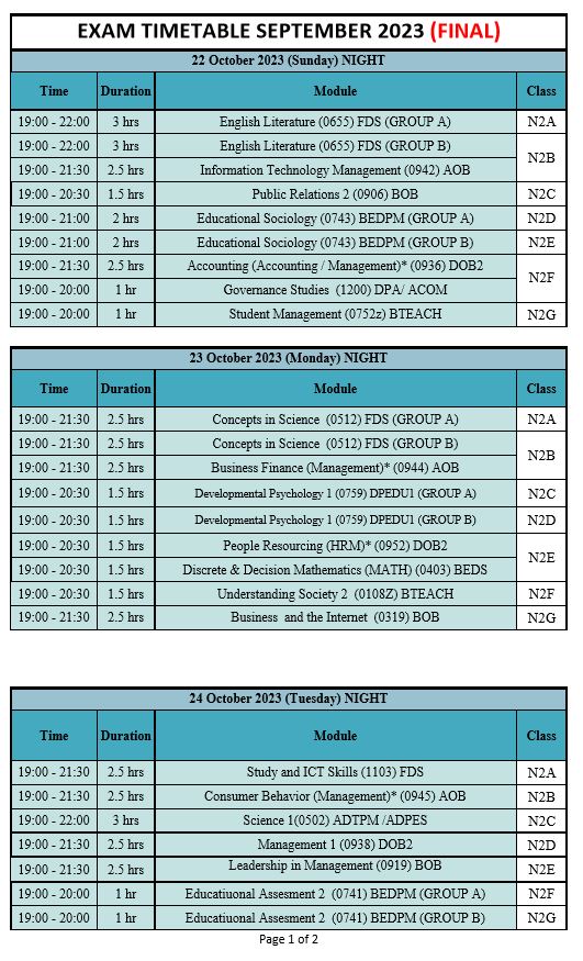 Exam Timetable (FINAL) by Saleema Hassan - Saturday, 14 October 2023, 11:34 AM Number of replies: 0 Exam Timetable Notice to CandidatesStudent GroupsPlease read the NOTICE FOR CANDIDATES before attending the exam Permalink