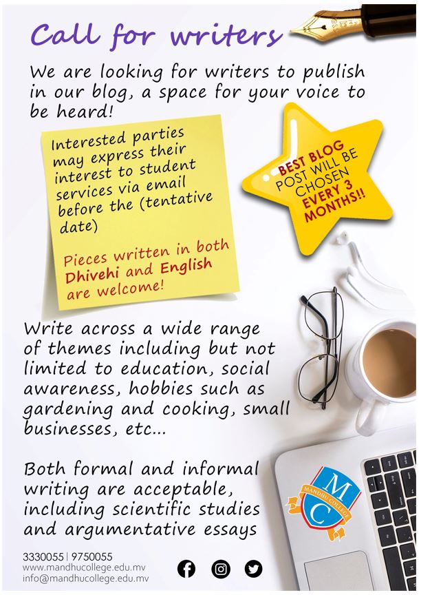 Call for Writers by Saleema Hassan - Tuesday, 14 December 2021, 1:46 PM Number of replies: 0 All interested individuals may contact student services via email on or before the 21st of December! Permalink