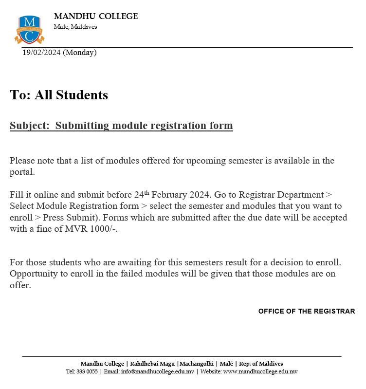 Module Registration (March 2024) by Saleema Hassan - Monday, 19 February 2024, 4:23 PM Number of replies: 0 Permalink