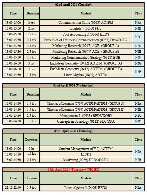 EXAM TIMETABLE (FINAL) by Saleema Hassan - Sunday, 24 March 2024, 12:03 PM Number of replies: 0 Exam Timetable Notice to CandidatesStudent GroupsPlease read the NOTICE FOR CANDIDATES before attending the exam Permalink