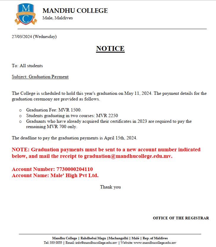 Graduation Payment by Saleema Hassan - Wednesday, 27 March 2024, 11:46 AM Number of replies: 0 Permalink