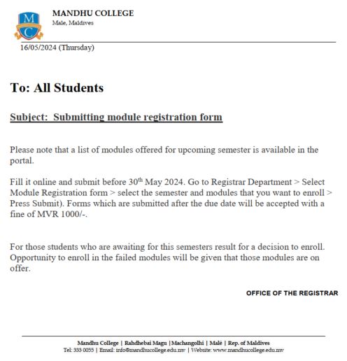 Module Registration by Saleema Hassan - Thursday, 16 May 2024, 10:14 PM Number of replies: 0 Permalink