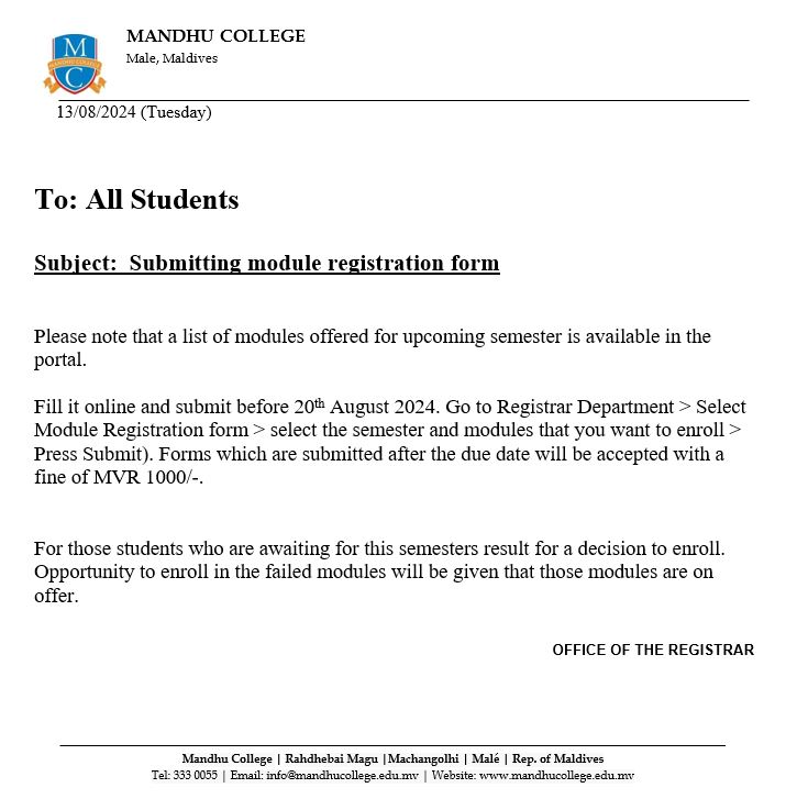 Module Registration by Saleema Hassan - Tuesday, 13 August 2024, 4:12 PM Number of replies: 0 Permalink